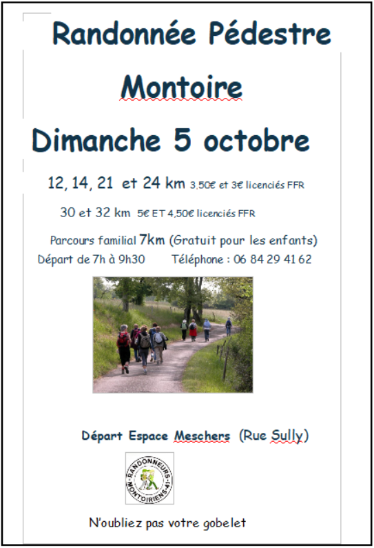 Le club les Randonneurs Montoiriens organise le dimanche 5 octobre sa randonnée d'Automne au départ de l'Espace Meschers à Montoire (rue Sully).