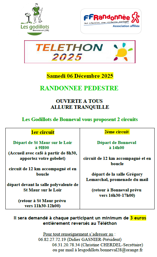 Après-midi : Départ de Bonneval à 14h00, également un circuit de 12 km. Rendez-vous devant la salle Grégory Lemarchal, promenade du mail.